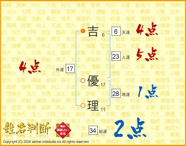 吉(6画) 優(17画)理(11画)