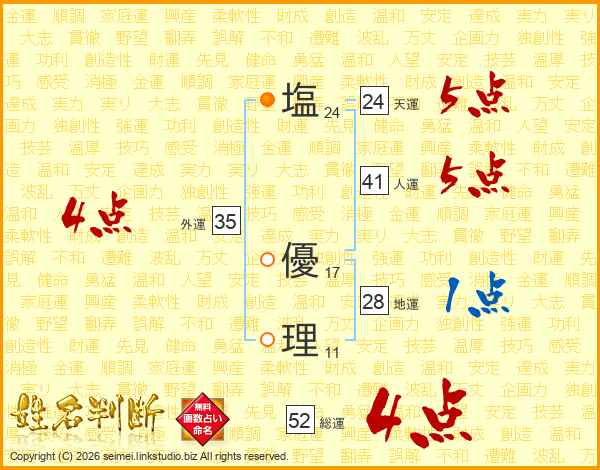 塩(24画) 優(17画)理(11画)