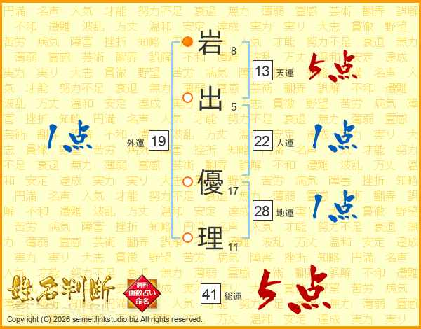 生活面を象徴する運勢です。外部から受ける影響力を表し、結婚運、家庭運や職場、環境への順応性を表します。総運から人運を引いた画数。姓や名が1文字の場合を除く。