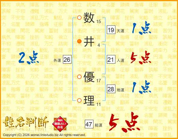 生活面を象徴する運勢です。外部から受ける影響力を表し、結婚運、家庭運や職場、環境への順応性を表します。総運から人運を引いた画数。姓や名が1文字の場合を除く。
