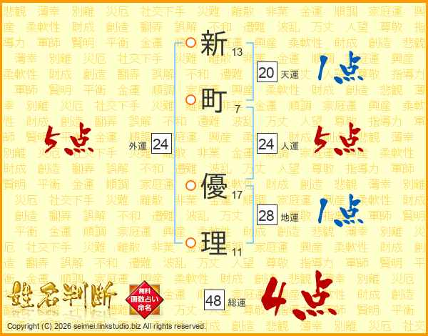 生活面を象徴する運勢です。外部から受ける影響力を表し、結婚運、家庭運や職場、環境への順応性を表します。総運から人運を引いた画数。姓や名が1文字の場合を除く。