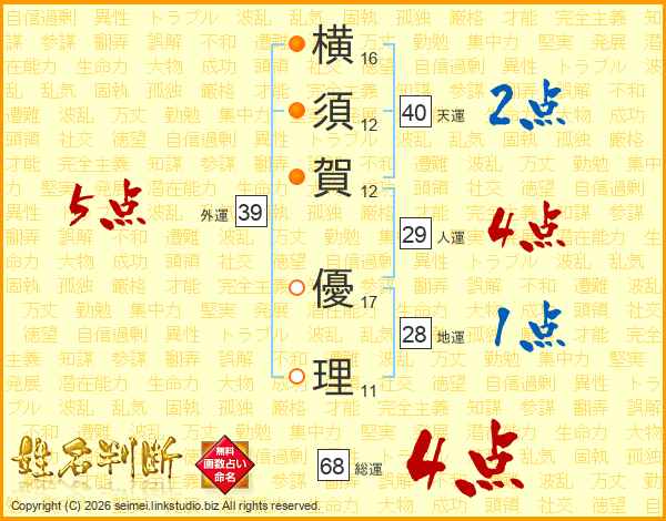 横(16画)須(12画)賀(12画) 優(17画)理(11画)