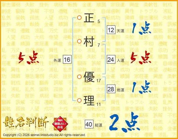 生活面を象徴する運勢です。外部から受ける影響力を表し、結婚運、家庭運や職場、環境への順応性を表します。総運から人運を引いた画数。姓や名が1文字の場合を除く。
