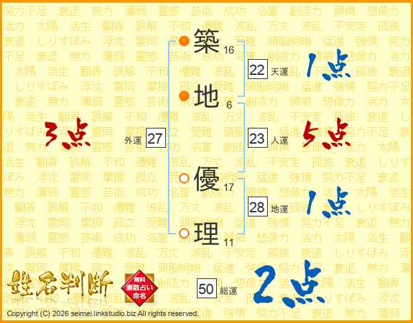 築(16画)地(6画) 優(17画)理(11画)