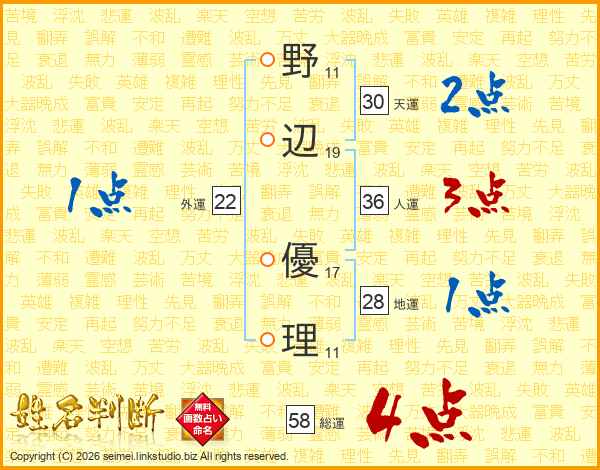 生活面を象徴する運勢です。外部から受ける影響力を表し、結婚運、家庭運や職場、環境への順応性を表します。総運から人運を引いた画数。姓や名が1文字の場合を除く。