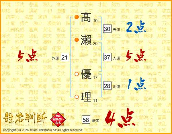 髙瀨優理さんの総運は58画の4点!