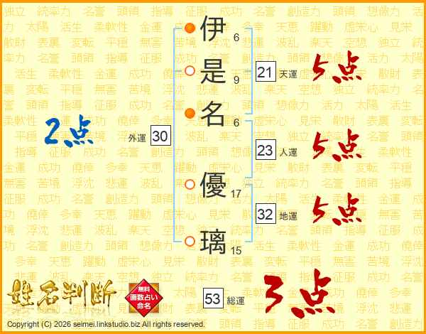 伊(6画)是(9画)名(6画) 優(17画)璃(15画)
