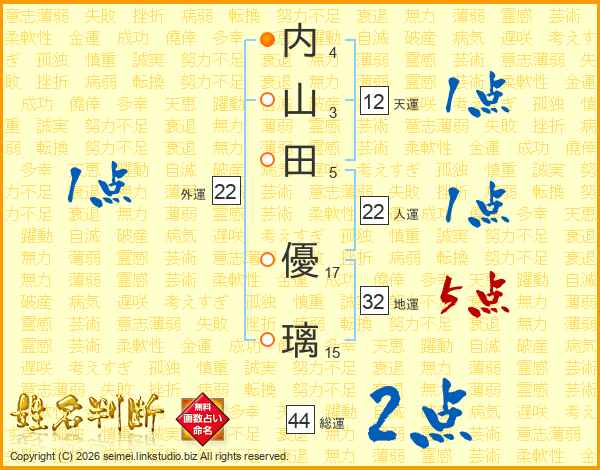 内(4画)山(3画)田(5画) 優(17画)璃(15画)