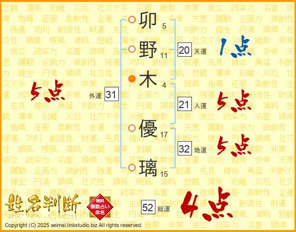 卯(5画)野(11画)木(4画) 優(17画)璃(15画)