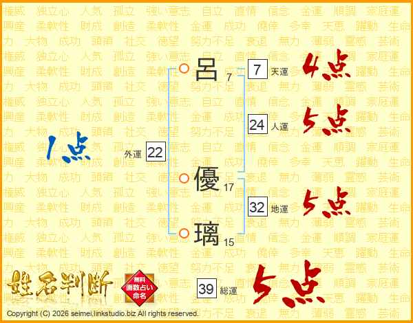 呂優璃さんの総運は39画の5点!