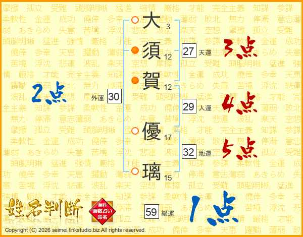 大(3画)須(12画)賀(12画) 優(17画)璃(15画)