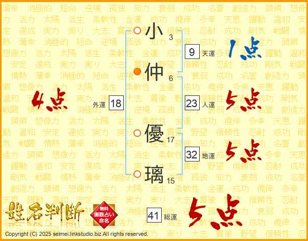生活面を象徴する運勢です。外部から受ける影響力を表し、結婚運、家庭運や職場、環境への順応性を表します。総運から人運を引いた画数。姓や名が1文字の場合を除く。