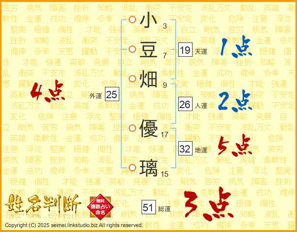 小(3画)豆(7画)畑(9画) 優(17画)璃(15画)