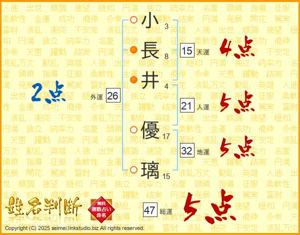 小(3画)長(8画)井(4画) 優(17画)璃(15画)