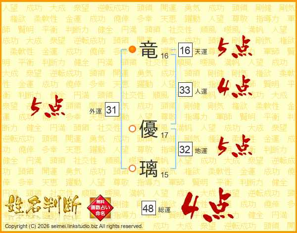 竜(16画) 優(17画)璃(15画)