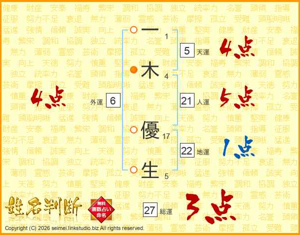 生活面を象徴する運勢です。外部から受ける影響力を表し、結婚運、家庭運や職場、環境への順応性を表します。総運から人運を引いた画数。姓や名が1文字の場合を除く。