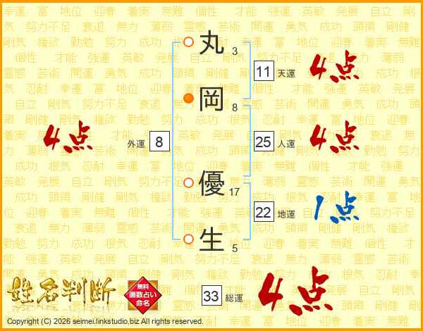 丸(3画)岡(8画) 優(17画)生(5画)