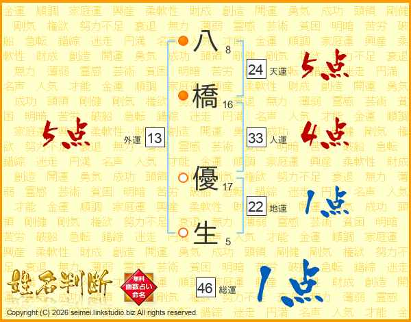 生活面を象徴する運勢です。外部から受ける影響力を表し、結婚運、家庭運や職場、環境への順応性を表します。総運から人運を引いた画数。姓や名が1文字の場合を除く。
