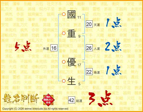あなたの人生を表す1番重要な運勢です。生涯を通じて影響する総合運となり、主に50歳以降の晩年期に影響を及ぼします。苗字と名前の合計画数。
