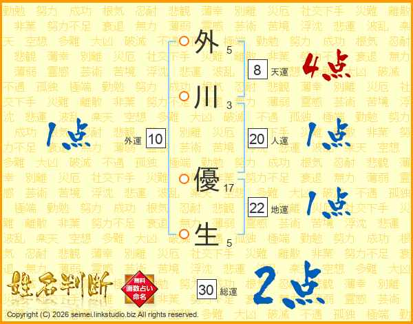 生活面を象徴する運勢です。外部から受ける影響力を表し、結婚運、家庭運や職場、環境への順応性を表します。総運から人運を引いた画数。姓や名が1文字の場合を除く。