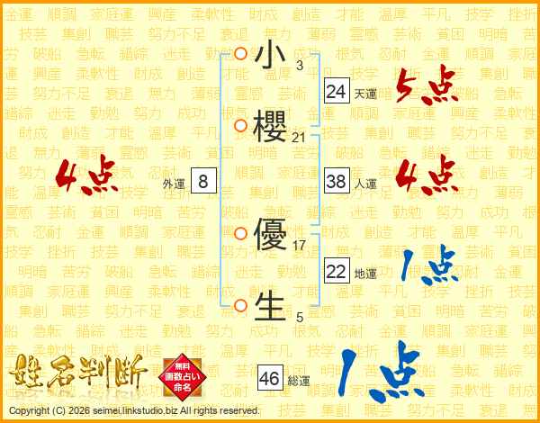 小(3画)櫻(21画) 優(17画)生(5画)