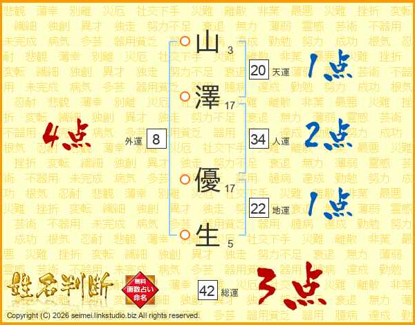 山(3画)澤(17画) 優(17画)生(5画)