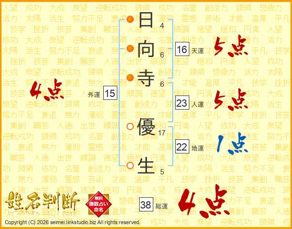 日(4画)向(6画)寺(6画) 優(17画)生(5画)
