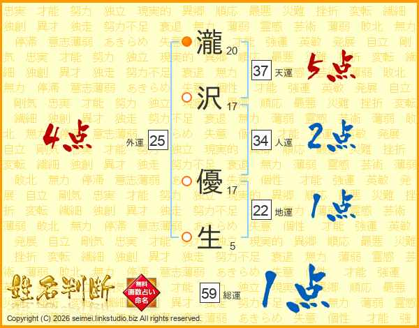 瀧(20画)沢(17画) 優(17画)生(5画)