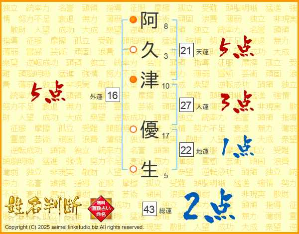 阿(8画)久(3画)津(10画) 優(17画)生(5画)