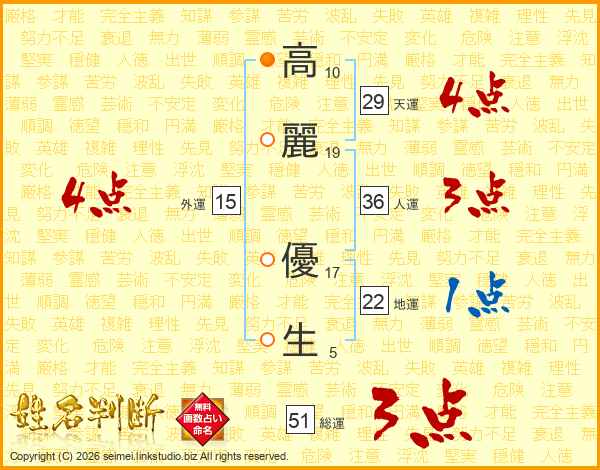 高(10画)麗(19画) 優(17画)生(5画)