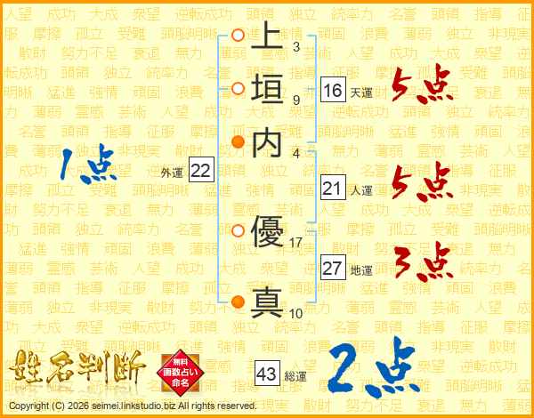 上(3画)垣(9画)内(4画) 優(17画)真(10画)