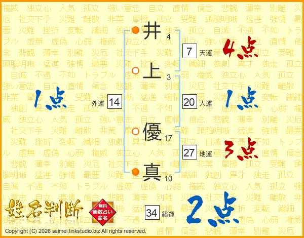 井(4画)上(3画) 優(17画)真(10画)