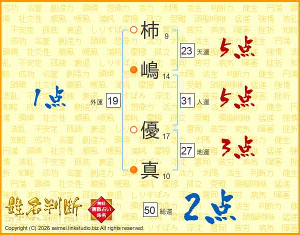 柿(9画)嶋(14画) 優(17画)真(10画)