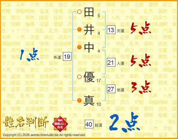 田(5画)井(4画)中(4画) 優(17画)真(10画)