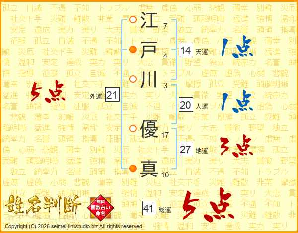 江(7画)戸(4画)川(3画) 優(17画)真(10画)