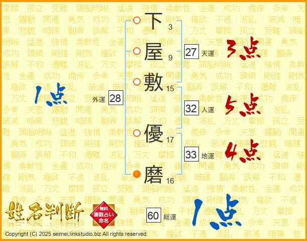 下(3画)屋(9画)敷(15画) 優(17画)磨(16画)
