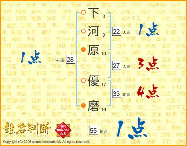 下(3画)河(9画)原(10画) 優(17画)磨(16画)