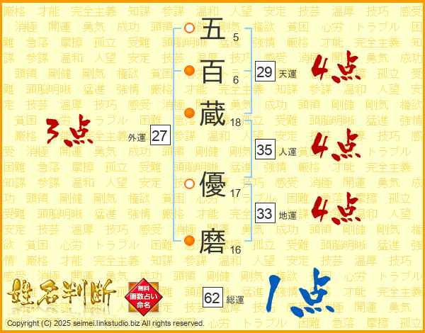 五(5画)百(6画)蔵(18画) 優(17画)磨(16画)