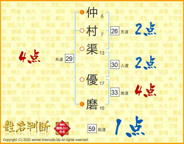 仲(6画)村(7画)渠(13画) 優(17画)磨(16画)