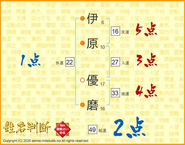 伊(6画)原(10画) 優(17画)磨(16画)