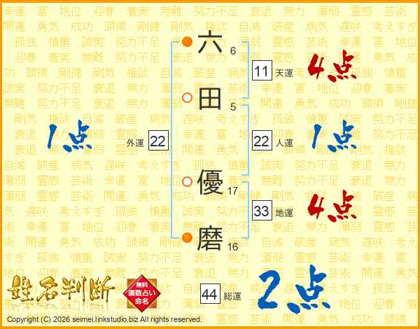 六田優磨さんの総運は44画の2点!