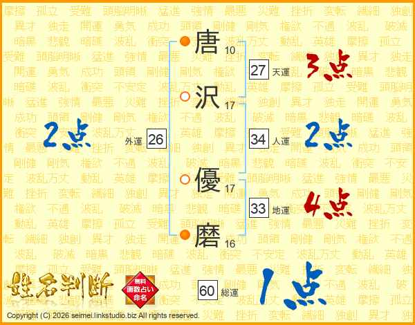 唐(10画)沢(17画) 優(17画)磨(16画)