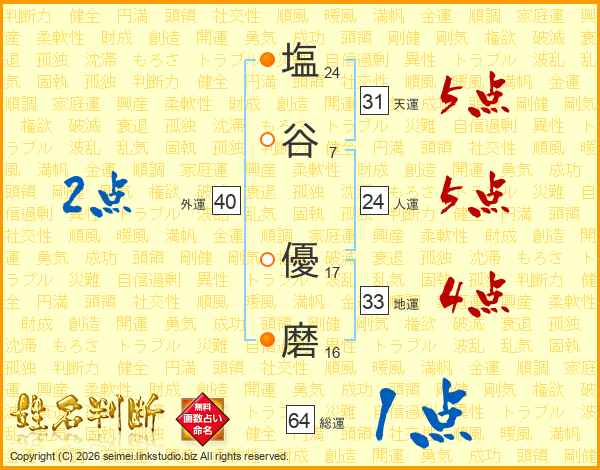 塩(24画)谷(7画) 優(17画)磨(16画)