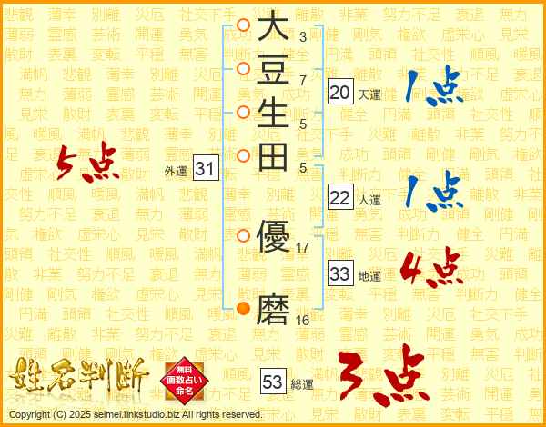 大(3画)豆(7画)生(5画)田(5画) 優(17画)磨(16画)