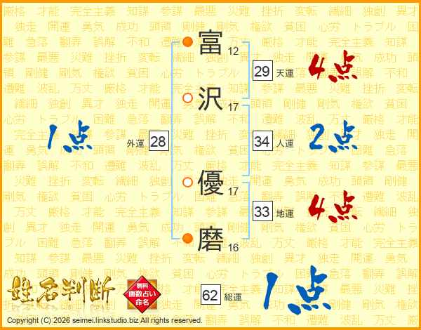 富(12画)沢(17画) 優(17画)磨(16画)