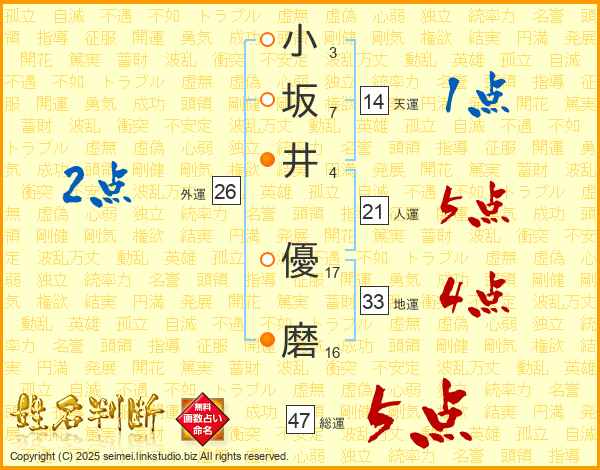 小(3画)坂(7画)井(4画) 優(17画)磨(16画)