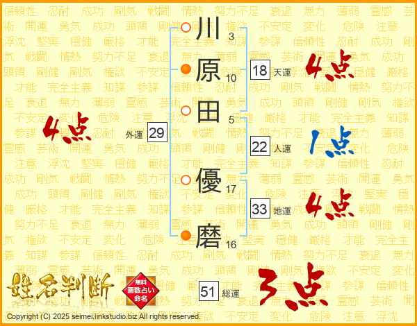 川(3画)原(10画)田(5画) 優(17画)磨(16画)