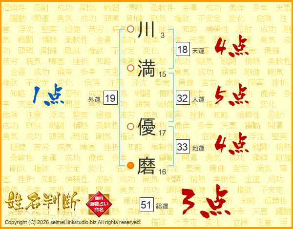 生活面を象徴する運勢です。外部から受ける影響力を表し、結婚運、家庭運や職場、環境への順応性を表します。総運から人運を引いた画数。姓や名が1文字の場合を除く。