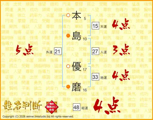 本(5画)島(10画) 優(17画)磨(16画)