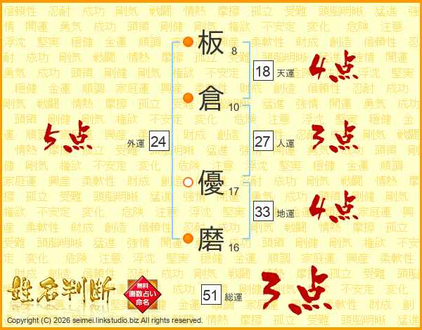 生活面を象徴する運勢です。外部から受ける影響力を表し、結婚運、家庭運や職場、環境への順応性を表します。総運から人運を引いた画数。姓や名が1文字の場合を除く。